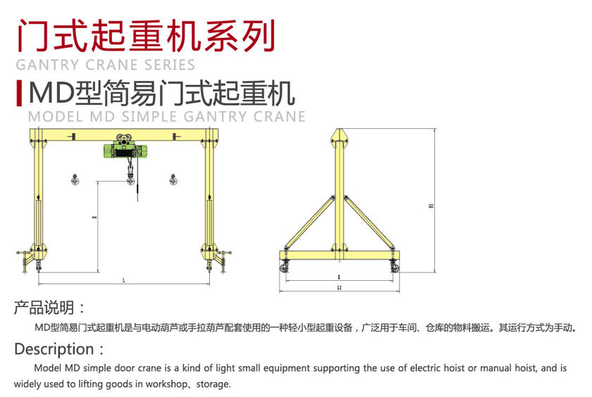 MD型簡(jiǎn)易門式起重機(jī)廣泛用于廠礦、倉(cāng)庫(kù)、碼頭、對(duì)工件、貨物的起吊、裝卸。我廠承擔(dān)設(shè)計(jì),制造,安裝一條龍服務(wù)。產(chǎn)品暢銷全國(guó)二十多個(gè)省、市,并出口東南亞地區(qū),質(zhì)量過(guò)硬,安全可靠,價(jià)格合理,深受廣大用戶好評(píng)。